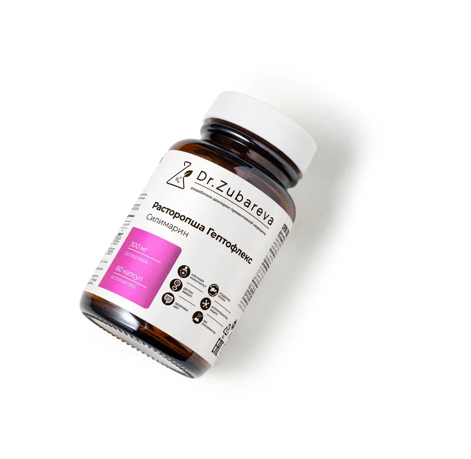 - Расторопша Гептофлекс позаботится о печени, восстановит её повреждённые клетки, повысит уровень глутатиона для полноценной детоксикации органа.