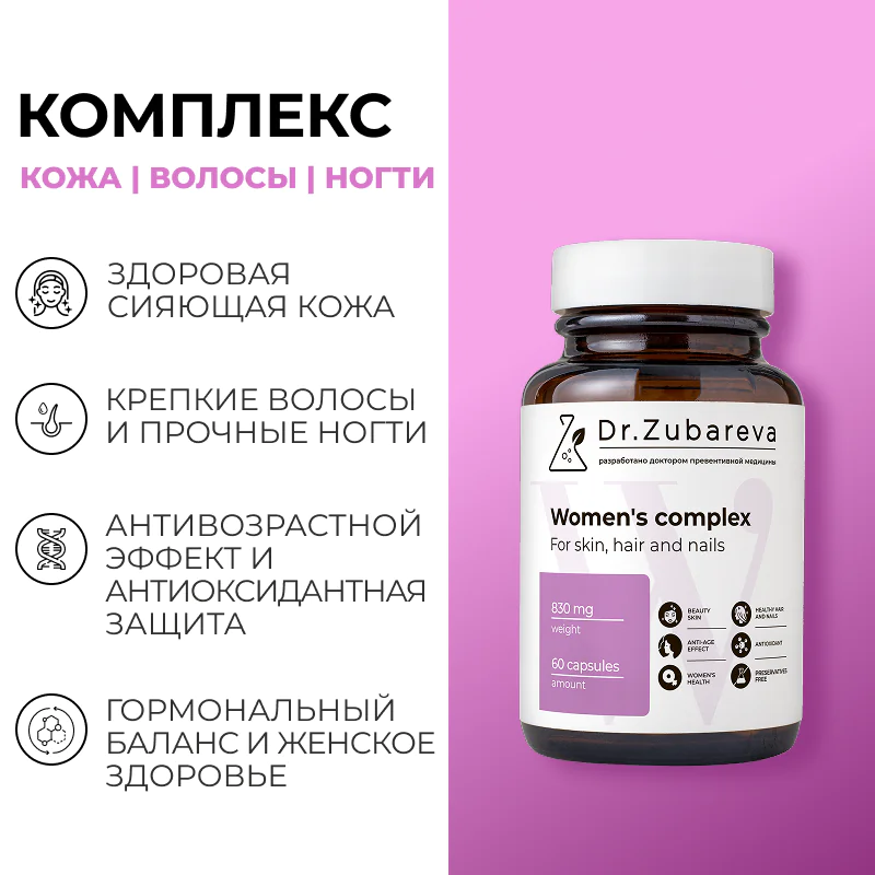 Women’s Care для кожи, волос и ногтей от Dr.Zubareva — это мультивитаминный комплекс для женщин, который не борется с внешними проявлениями внутренних проблем, а помогает восполнить ресурсы, необходимые организму для восстановления естественной красоты и здоровья.