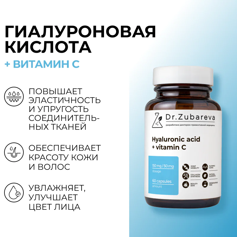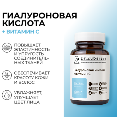 Гиалуроновая кислота с витамином С Dr.Zubareva — это идеальный антивозрастной комплекс, который работает изнутри, обеспечивая максимальное увлажнение и реальную защиту от преждевременного старения.